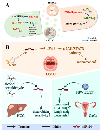 Exogenous factors and drugs affect the level of miR-944. (A) miR-944 is involved in the treatment of NSCLC and HNSCC by matrine and 188Re-liposome, respectively; (B) exogenous factors (including NNK, HPV E6/E7, and alcohol and acetaldehyde) affect the expression level of miR-944 in the OSCC, CxCa, and HCC.