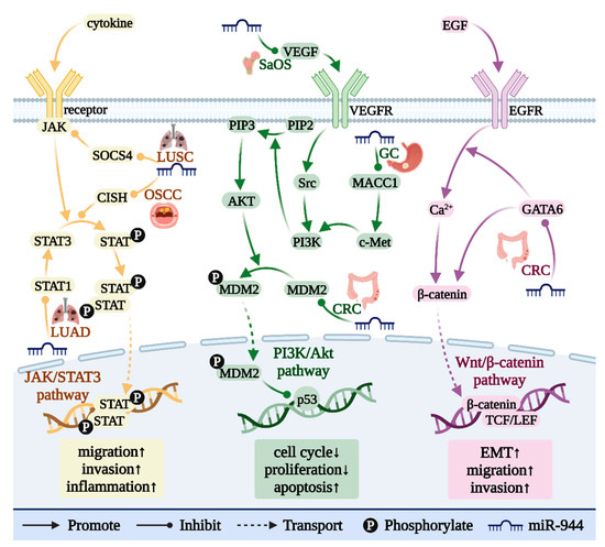 As shown in Figure 6, miR-944 is involved in three signaling pathways that regulate the occurrence and development of cancer. miR-944 is involved in regulating the Wnt/β-catenin signaling pathway by targeting GATA6 in CRC [8]. miR-944 is involved in regulating the Jak/STAT3 signaling pathway by targeting CISH in OSCC [44], STAT1 in LUAD [30], and SOCS4 in LUSC [21]. In the PI3K/AKT signaling pathway, miR-944 targets VEGF in osteosarcoma (SaOS) [39], MACC1 in GC [35], and MDM2 in NPC [7] and CRC [37].