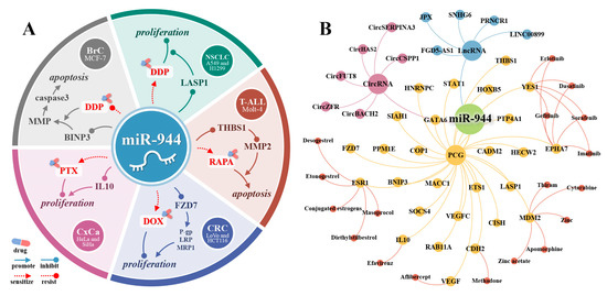 The miR-944-related therapeutic drugs. (A) miR-944 is associated with resistance to 4 drugs (DDP, RAPA, DOX, and PTX); (B) the target drugs of miR-944′s PCGs and the ceRNA/miR-944/PCG axes in the CADDIE database.
