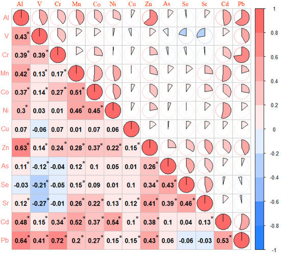 Spearman’s correlation heatmap matrix of ln-transformed serum trace element concentrations among the study participants. Abbreviations: Al, Aluminum; V, Vanadium; Cr, Chromium; Mn, Manganese; Co, Cobalt; Ni, Nickel; Cu, Copper; Zn, Zinc; As, Arsenic; Se, Selenium; Sr, Strontium; Cd, Cadmium; Pb, Lead. * p < 0.05.