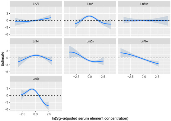 Based on the results of the multivariate logistic regression model, we further selected seven trace elements (Al, V, Mn, Ni, Zn, Se, Sr) for BKMR analysis. Figure S1 shows that Al, V, Mn, Ni, Zn, Se and Sr were of high importance in the model, especially for V, Ni, Zn, Se and Sr (all PIP = 1.00). A linear relationship between ESCC risk and individual exposures to Al, V, Ni, Zn, Se and Sr was found when other elements were fixed at the median (Figure 2). A negative trend was found for ESCC risk with serum Se concentrations, which is consistent with the results of multi-element logistic regression, whereas the dose–response curve for Zn tended to be linear but was smooth slightly at lower or elevated concentrations. Notably, the dose–response relationship between ESCC risk and serum V, Ni and Sr concentration was an inverted U-shape, whereas serum Al concentration showed a positive trend with ESCC. A dose–response relationship between serum Mn concentration and EC risk was barely observed.