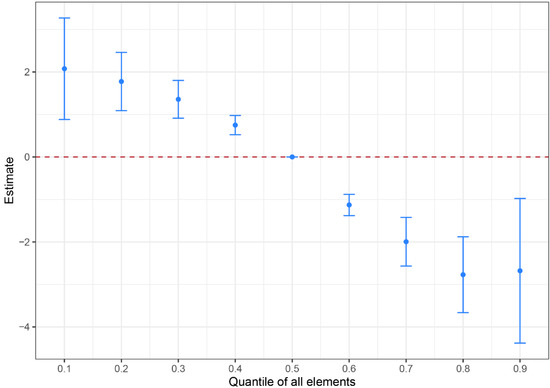 A statistically significant overall effect of the seven trace elements on the risk for ESCC is shown in Figure 3. When the overall mixture was at or lower than the 40th percentile, exposure to the mixture showed increased risk for ESCC as compared with their concentrations at the 50th percentile, and these elements were associated with less risk when at or above the 60th percentile compared with their concentrations at the 50th percentile.