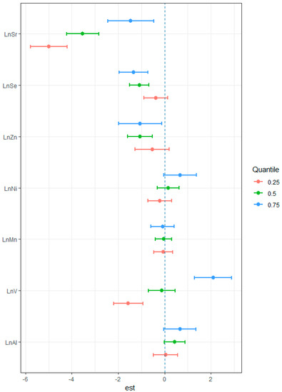 We finally analyzed the effect of the interaction of these seven trace elements (Figure S2). From the figure, we see that the risk for Sr and V increased by 3.53 and 3.66 units when the other trace elements were fixed at their 25th percentile as compared to when they are fixed at their 75th percentile. As for Se, the risk decreased inversely by 0.963 units.