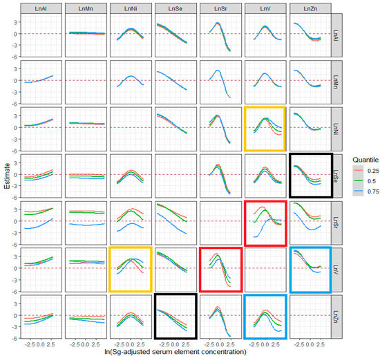 To explore the interaction among the seven trace elements, we further visualized the bivariate exposure–response functions and calculated the interaction effects. An interaction between Sr and V, as well as Ni and V, was also identified for the risk for ESCC, such that the inflection point for Ni increased with elevated levels of V (yellow rectangles), while the inflection point of V was lowered with increasing levels of Sr (red rectangles) (Figure 5). In addition, the potential interactions between V and Zn (blue rectangles) were also observed; when the level of Zn increased, the slope of V became steeper when the other five trace elements were at their median. Moreover, a synergistically protective effect between Se and Zn (black rectangles), two protective factors in the univariate exposure–response analysis, was also found in the analysis.