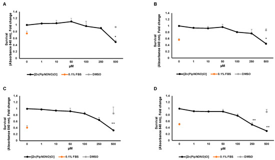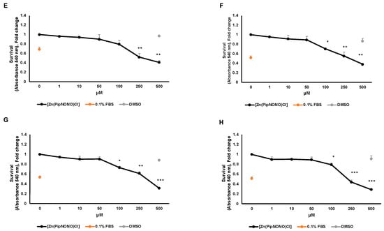 Effect of [Zn(PipNONO)Cl] on tumor cell survival. Dose–response curves of A549 cells treated with [Zn(PipNONO)Cl] after 24 h (A), 48 h (B), 72 h (C) and 96 h (D); and those of A375 in the same experimental conditions (E–H). The graphs show the cell survival response following treatment with [Zn(PipNONO)Cl], used at increasing concentrations (from 1 to 500 μM), in the presence of medium with 10% FBS. The values of the means for each experimental point were normalized on the basal condition of medium with 10% FBS (set arbitrarily equal to 1). Medium with 0.1% FBS was used as a negative control, and DMSO used at a concentration of 0.5% was tested as a vehicle control. * p ˂ 0.05, ** p ˂ 0.01 and *** p < 0.001 vs. control and DMSO.