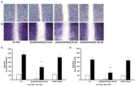 Effect of [Zn(PipNONO)Cl] on the migration and invasiveness of tumor cells. Scratch assay of A549 (A) and A375 (B) treated with various concentrations (10, 50 and 100 μM) of [Zn(PipNONO)Cl] for 18 h. Representative images taken with 4× magnification. (C,D) In the invasion assay, A549 (C) and A375 (D) were exposed to 100 μM [Zn(PipNONO)Cl] or DMSO (0.1%) and then allowed to migrate toward different serum concentrations (1% and 5%, white and black columns, respectively) put in the lower compartments of the Boyden chamber, the porous filter being coated with gelatin. Number in the graphs are counted cells/well. * p ˂ 0.05 vs. control and DMSO; ** p ˂ 0.01 vs. control and DMSO.