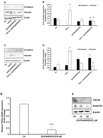 TGF-β1 is a strong inducer of EMT through loss of epithelial markers and gain of mesenchymal markers [24,25,53]. Tumor cells exposed for 96 h to exogenous TGF-β1 acquired elongated shape. The co-treatment with [Zn(PipNONO)Cl] inhibited the expression of TGF-β1-stimulated EMT markers, maintained the expression of epithelial markers (E-cadherin) and downregulated the mesenchymal one (vimentin). Further, the zinc-based nonoate reduced the autocrine loop of this cytokine, which is critical in cancer malignancy, starting from a transcriptional level.