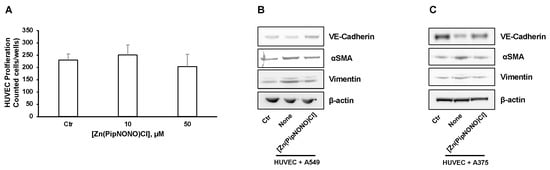 The EndMT phenomenon, characterized by loss of endothelial properties and the acquisition of a mesenchymal phenotype, was studied by Western blot in endothelial cell monolayers exposed to cancer cells in the co-culture system. Our aim was to evaluate whether [Zn(PipNONO)Cl] could mitigate the effect of tumor-derived products on the induction of EndMT. The expression of vimentin and αSMA (mesenchymal markers) and VE-cadherin (typical endothelial marker) was studied on HUVEC lysates. Four days of co-culturing with tumor cells induced an increase in the expression of both vimentin and αSMA in HUVECs. Following the co-culture with [Zn(PipNONO)Cl], these markers were reduced (Figure 4B for A549 and Figure 4C for A375 co-culture). Contrary to this, the expression of VE-cadherin (endothelial marker) reduced in endothelial cells co-cultured with tumor cells, and the treatment of the co-culture with [Zn(PipNONO)Cl] caused an increase in the expression of endothelial marker, restoring the endothelial phenotype to a normal condition (Figure 4B,C).