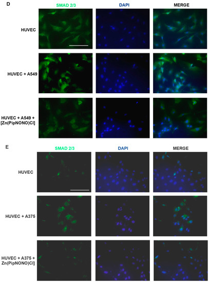 The TGF-β1 signaling molecule Smad2/3 was visualized in HUVECs by immunofluorescence analysis. A total of 3 × 104 HUVECs were seeded on 1 cm circular glass coverslips added in the bottom of a 24 well multiplate. Tumor cells were seeded at a density of 2 × 104 on the top of 0.4 μm pore polycarbonate membranes of the transwells. After 24 h of incubation, transwells were put in the same 24 multiplates and co-cultured (in medium with 2% FBS) for 4 days. Where indicated, co-cultures were treated with 50 µM [Zn(PipNONO)Cl], readded every 48 h. Immunofluorescence analysis was performed as previously reported [51] using anti Smad2/3 antibody (rabbit, 1:500, catalog number 8685S) from Cell Signaling Technology, Inc. (Danvers, MA, USA), and DAPI as nuclear counterstaining dye. Images were taken using a confocal microscope (Zeiss LSM700; Zeiss GmbH, Oberkochen, Germany).
