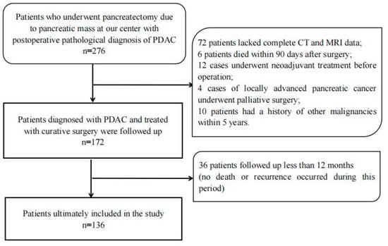 As shown in Figure 1, a total of 276 patients in our center underwent pancreatectomy for pancreatic tumors and were pathologically diagnosed as having PDAC. A total of 140 patients were excluded from the cohort for the following reasons: 72 patients did not have complete enhanced CT and MRI data available for analysis within 14 days before surgery; 6 patients died within 90 days after surgery; 12 patients received neoadjuvant treatment before surgery; 4 patients underwent palliative surgery for locally advanced pancreatic cancer; 10 patients had a history of other malignancies within the last 5 years; another 36 patients (13.1%) were excluded because they were followed up for less than 12 months (no death or recurrence occurred during this period). The remaining 136 patients were included in the final analysis; their clinical–pathologic and radiologic characteristics are shown in Table 1. The average age of the patients was 65 ± 9.1 years. Among these patients, 62 were women and 74 were men. Surgical methods included 86 cases of pancreaticoduodenectomy (PD) (including 15 cases of vascular resection), 42 cases of distal pancreatectomy (DP) (including 2 cases of vascular resection), and 8 cases of total pancreatectomy (TP) (including 2 cases of vascular resection). A total of 82 patients received adjuvant chemotherapy after surgery.