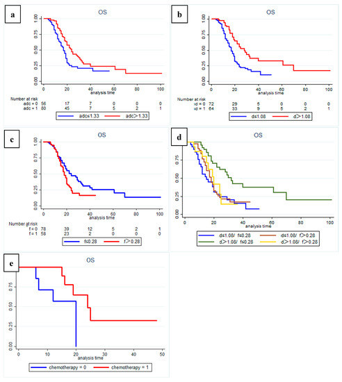 Kaplan–-Meier curves showing overall survival (OS) with clear differences between (a) high-ADC value group (sADC > 1.33 × 10−3 mm2/s) and low-ADC value group (sADC ≤ 1.33 × 10−3 mm2/s); (b) high-D value group (sD > 1.08 × 10−3 mm2/s) and low-D value group (sD ≤ 1.08 × 10−3 mm2/s); (c) low-f group (sf ≤ 0.28) and high-f group (sf > 0.28). (d) Subgroup analysis showed that patients in the high-D value combined with the low-f value group had a significantly better OS than patients in the other subgroups (p = 0.001). Additional subgroup analysis also identified (e) a significant positive effect of postoperative adjuvant chemotherapy on overall survival for patients in the high-D value combined high-f value group (p = 0.034).
