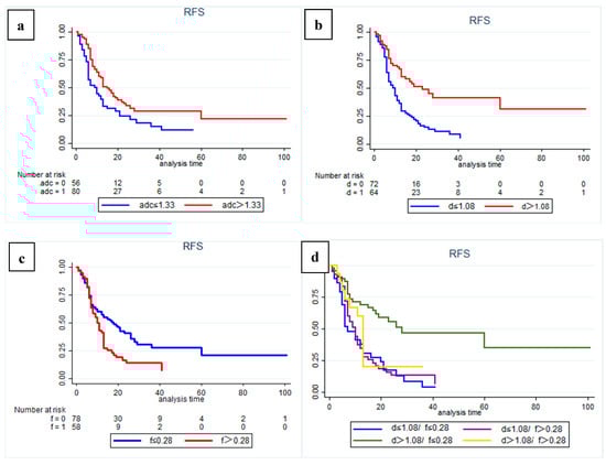 Kaplan–Meier curves showing recurrence-free survival (RFS) with clear differences in (a) high-ADC value group (sADC > 1.33 × 10−3 mm2/s) and low-ADC value group (sADC ≤ 1.33 × 10−3 mm2/s); (b) high-D value group (sD > 1.08 × 10−3 mm2/s) and low-D value group (sD ≤ 1.08 × 10−3 mm 2/s); (c) low-f group (sf ≤ 0.28) and high-f group (sf > 0.28). (d) Subgroup analysis showed that patients in the high-D value combined with low-f value group had a significantly better RFS than patients in the other subgroups (p = 0.001).