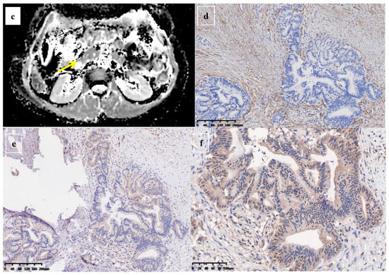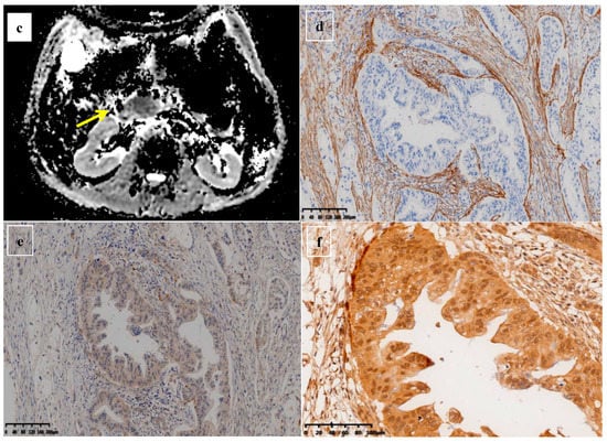 A 58-year-old woman was found to have a tumor with a head size of about 2.2 cm in the pancreas, which was pathologically confirmed to be pancreatic ductal adenocarcinoma after surgery; we found that the tumor was characterized by a high ADC value, high D value, and low f value after quantitative MRI measurement. She survived for 61 months without recurrence after surgery. MRI T2 (a); DWI (b); and ADC map (c) showed solid mass in the head of pancreas with measured ADC of 1.59 × 10−3 mm2/s, D value of 1.41 × 10−3 mm2/s, and f value of 0.18. Immunohistochemical staining showed that a few cancer-associated fibroblasts (CAFs) were present in the stroma ((d) α-SMA, ×10), carcinoma cells weakly expressed VEGF in the cytoplasm ((e) VEGF, ×10), and carcinoma cells showed weak immunoreaction of anti-HIF-1a in the nuclear((f) HIF-1α, ×20). These findings suggested that the tumor microenvironment was relatively quiet with a lower hypoxia level.