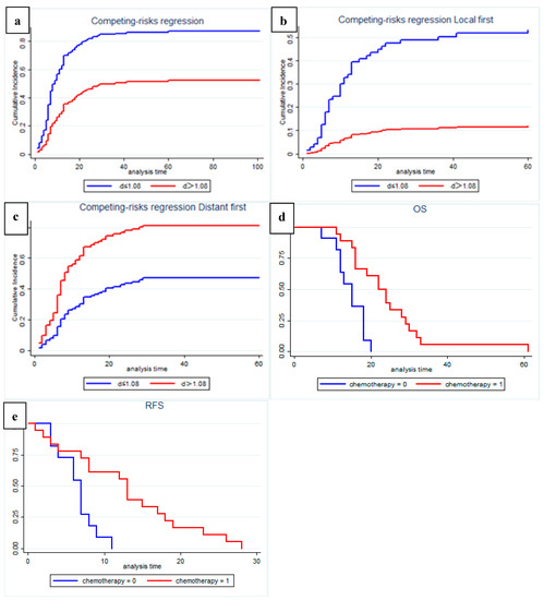 Recurrence risk and pattern analysis according to multiparametric quantitative MRI: (a) Fine and gray curve show risk of recurrence (p = 0.001); (b) Cause-specific analysis of competing risk of local recurrence pattern (p = 0.001); (c) Cause-specific analysis of competing risk of distant recurrence pattern (p = 0.001); (d,e) Among patients with distant recurrence, patients in the high-D value group who received postoperative chemotherapy may have significantly improved OS (p = 0.001) and RFS (p = 0.003).