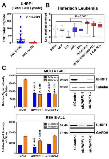 UHRF1 protein and gene expression in leukemia subtypes and their knockdown effects on cell proliferation. (A) Scatter plot of UHRF1 protein expression in patient-derived primary ALL (n = 56) and AML samples (n = 76). p = 0.0001 vs. AML samples based on mass spectrometry spectral counts of UHRF1 tryptic peptides. (B) Haferlach Leukemia Cohort transcriptomic dataset was used to evaluate the expression of UHRF1 in different subtypes of leukemia. (C) Knockdown efficiency of UHRF1 siRNA in MOLT4 (T-ALL) cells. siRNA knockdown efficiency was confirmed after 48 h by immunoblotting, and an MTS assay was performed at 24 and 48 h after transfection. Each experiment was performed in triplicate (n = 3). The uncropped blots are shown in Figure S1.