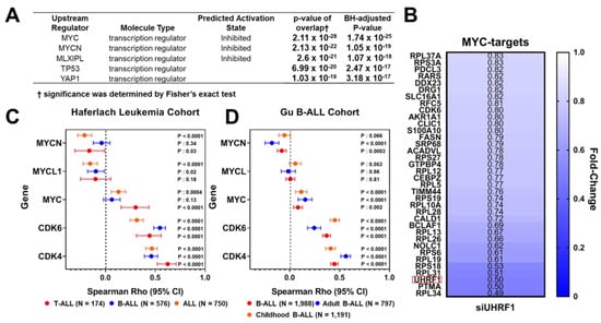 UHRF1 interacts with c-Myc protein. (A) An Ingenuity Pathway Analysis of 345 differentially expressed proteins (fold change ≥ 1.2 or ≤0.83) following a siRNA-mediated knockdown of UHRF1 in MOLT4 T-ALL cells compared with that of siControl. (B) Heatmap depicting fold-change in protein levels of annotated downstream MYC-targets in MOLT4 T-ALL cells following a siRNA-mediated knockdown of UHRF1 compared with that of siControl. Fold change < 1 indicates that the protein expression was reduced following a siRNA-mediated knockdown of UHRF1. Red box highlights UHRF1. (C,D) Distribution plot illustrating Spearman r coefficients (95% CI) for the association between gene expression of UHRF1 and mRNA levels of MYC, MYCL1, MYCN, CDK6, and CDK4 amongst the ALL and ALL subtypes in the Haferlach (C) and Gu (D) Leukemia Cohorts [29,30].