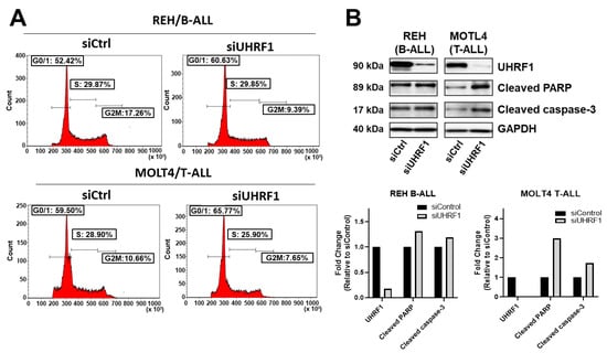 Knockdown of UHRF1 induces accumulation of cells in the G0/G1-phase and apoptosis. (A) Cell cycle analysis of REH B-ALL and MOLT4 T-ALL cells following a siRNA-mediated knockdown of UHRF1. (B) Immunoblots for UHRF1, cleaved PARP, and cleaved caspase-3 following a siRNA-mediated knockdown of UHRF1 in REH B-ALL and MOLT4 T-ALL cells. Densitometry measurements normalized against GAPDH loading control are provided. The uncropped blots are shown in Figure S1.