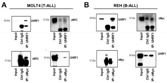 The regulation of the c-Myc protein expression is controlled through complex systems, including targeted degradation by the ubiquitin-proteasome system [40]. UHRF1 is known to exert ubiquitin ligase functions [41]. We assessed whether endogenously expressed UHRF1 directly interacted with c-Myc using co-immunoprecipitation (co-IP) assays applied to MOLT4 T-ALL cells and REH B-ALL cells. Western blotting of the IP showed that UHRF1 and c-Myc were enriched in the pulldown products from the two cell lines (Figure 5A,B). To further confirm the results of co-IP using the Western blotting results, anti-UHRF1 IP and control anti-IgG IP from REH cells (Figure 5B) were loaded onto SDS-PAGE, followed by Zn staining. The protein bands corresponding to UHRF1 and c-Myc based on the Western blot image were cut, in-gel digested, and analyzed by LC-MS/MS. The UHRF1 unique peptides and c-Myc unique peptides were identified in the anti-UHRF1 IP (FDR = 1%) but not in the control anti-IgG IP (Table A3 and Figure A4 in the Appendix A).