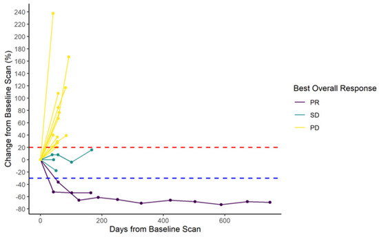 Response to AI plus pembrolizumab (N = 20). Spider plot showing relative change in tumor size from baseline. Each line represents one patient in study. Two patients had partial response (PR), three had stable disease (SD), and 15 had progression of disease (PD). One patient had sustained PR until end of treatment (35 cycles) of pembrolizumab plus exemestane and maintained response on single agent exemestane until data cut-off of July 2021. Red line indicates 20% of increased tumor size per RECIST 1.1. Blue line indicates 30% of reduced tumor size per RECIST 1.1.