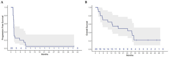 Progression-free survival and overall survival (N = 20). (A) Median PFS was 1.8 months (95% CI 1.6, 2.6), and (B) median OS was 17.2 months (95% CI 9.4, NA). Numbers above x-axis refer to number of patients.