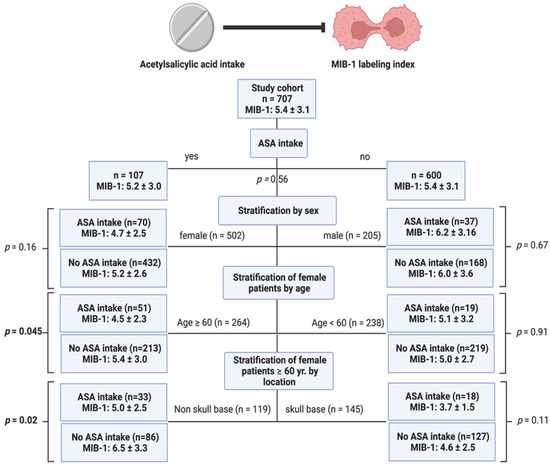 Flow diagram displaying the stratification of patients with or without ASA intake in the subgroups of sex and further stratification of female patients by age and elderly females by meningioma location. Statistical results of the independent t-test comparing the mean values and the corresponding standard deviations of the MIB-1 labeling indices are given. Significant statistical results are presented in bold.