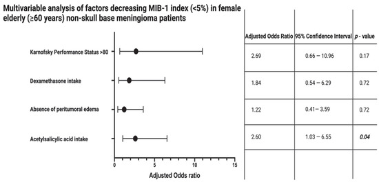 Forest plots from multivariable binary logistic regression analysis: Acetylsalicylic acid intake is an independent factor associated with an MIB-1 labeling index <5% in female elderly (≥60 years) non-skull-base meningioma patients. p-values in italics and bold display statistically significant results.