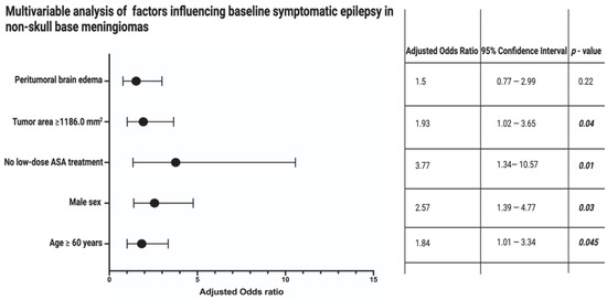 Forest plots from multivariable binary logistic regression analysis: Absence of low-dose ASA intake, male sex, age ≥ 60 years, and tumor area ≥1186.0 mm2 are independent predictors of a preoperative symptomatic epilepsy in non-skull-base meningiomas. p-values in bold and italics display statistically significant results.