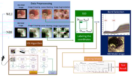 In this study, HSI (Smart Spectrum Cloud, Hitspectra Intelligent Technology Co., Ltd., Kaohsiung City, Taiwan) was combined with band selection and used to convert esophageal cancer images into spectral images to reduce the dimensions, and color reproduction was used to convert white-light images (WLIs) into narrowband endoscopic HSI images (NBI). Finally, deep learning was used to classify the images into three categories: normal, dysplasia, and SCC.