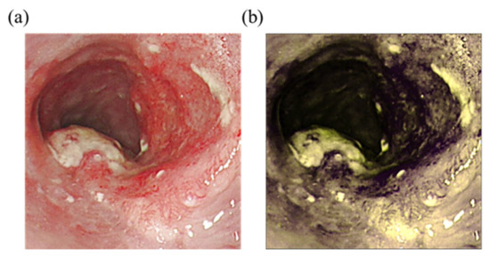 Two wavelengths, namely 415 and 540 nm, were selected to obtain the spectral information converted from the image. These wavelengths were specifically selected because of the different types of light in the images. The longer the wavelength, the deeper the penetration [53]. The red light is absorbed differently by heme in blood vessels based on the difference in depth [54]. As a result, the microvessels in the superficial mucosa tissue will be brown, and blood vessels in the submucosal tissue will be green, thereby creating a strong sense of hierarchy that is advantageous to identifying lesions of the mucosal tissue. Figure 2 shows the comparison of the WLIs and HSI images. The red color of blood vessels in the lesion in Figure 2a and those in Figure 2b were converted to purplish red color, which improved the contrast with the background, allowing doctors to more easily observe and diagnose cancer in its early stages.