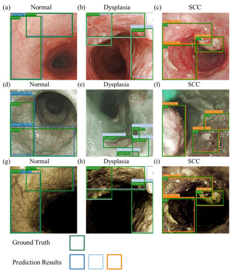 Schematic of the prediction results for WLIs, NBIs, and HSI images. (a–c) are the WLI prediction results. (d–f) are the NBI prediction results. (g–i) are the HSI prediction results. (a,d,g) are the normal period, and the green and blue boxes represent the real and predicted frames, respectively. (b,e,h) are the dysplasia period, and the green and gray boxes represent the real and predicted frames, respectively. (c,f,i) are the SCC period, and the green and orange boxes represent the ground truth box-predicted boxes, respectively.