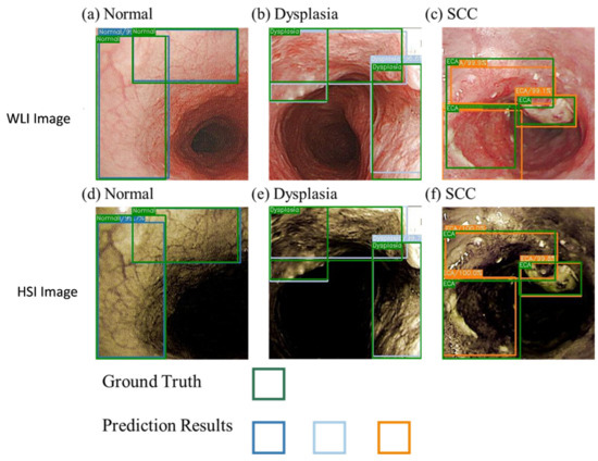 The NBI model showed a good performance in the SCC category and better prediction of the normal category compared with the other two models. This finding may be due to the higher consistency of the blood vessel features in normal images, which is conducive to the prediction of the box selection, compared with those in the other two models. In addition, the dataset showed a profound influence on the prediction results. Compared with the WLI, the accuracy and sensitivity of the HSI model have increased greatly. Figure 4 presents a schematic of the comparison of the prediction results of the WLI and HSI models. The highlighted blood vessel features of the HSI images resulted in similar prediction findings and ground truth box, thereby increasing the confidence level. The indicators in the dysplasia category of the WLI model increased significantly, and the gap with other evaluation indicators widened, improving the performance of the dysplasia category compared with that of the SCC category.