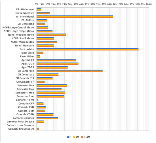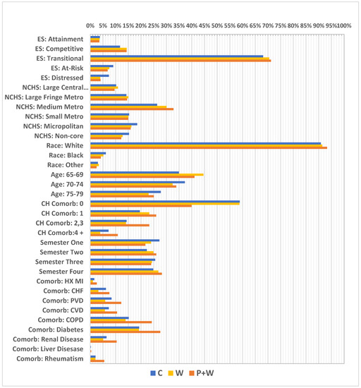 A great majority of the women in this sample came from counties with a transitional economic status (approximately 68%) (according to Appalachian Regional Commission information, “transitional counties are those transitioning between strong and weak economies. They make up the largest economic status designation. Transitional counties rank between the worst 25 percent and the best 25 percent of the nation’s counties”) [20] and lived in medium-sized metropolitan areas (about 26%) (according to the NCHS Urban-Rural Classification Scheme for Counties, “medium metro counties are counties in metropolitan statistical areas of 250,000 to 999,999 population”) [21]. Moreover, white women comprised 90% of the sample, having the highest level of representation. The largest part of the cohort represented those aged 70–74 (37%); however, the youngest age group (65–69) was smaller by only about 2%. A vast majority of women—almost 59% of them—had no Charlson index-defined comorbidities, while at the same time the most frequent comorbidity was diabetes (19%), followed by chronic obstructive pulmonary disease (COPD) (15%). Additionally, the highest number of visits had reference dates in the first investigated semester (27%) and the lowest in the second semester at 22% (Figure 4). Further, relatively high differences in percentages were observed in some cases between W and W+P, particularly for absence of Charlson index—58% vs. 39%, respectively, but also for women with index at level of 2,3—14% vs. 23%, and 4+—approximately 4% vs. 11%. Moreover, considerable differences were investigated between W and W+P for comorbidities such as: PVD—6% vs. 12%; CVD—5% vs. 10%; COPD—13% vs. 24%; renal disease—6% vs. 10%; and for diabetes 19% vs. 28% (Figure 3).