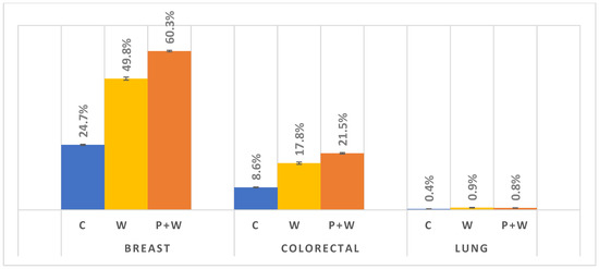 Finally, we investigated changes in cancer screening participation among women after W, P+W, and C during 1-year follow-up. Due to the large sample size, almost all comparisons were highly significant (the confidence intervals illustrated as error bars), except comparison between W and P+W for lung cancer. In the case of breast and colorectal cancer screenings, C was characterized by substantially lower participation. Nevertheless, in lung cancer cases we also observed a slight increase after W or P+W (0.5% and 0.4% increases, respectively). We also discovered that W and P+W were particularly effective in increasing breast cancer screening participation—for W an increase of about 25%, for P+W more than 35%. In the case of colorectal cancer screening differences between C and after W or P+W, these are lower—9.2% and 12.9%, respectively; however, here the difference between W and P+W is much lower (3.7%), unlike that for breast cancer screening (10.5%) (Figure 5).