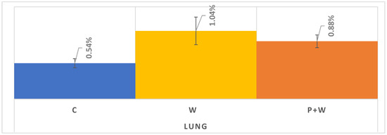 As mentioned in Materials and Methods (above), in order to more precisely present the effect of W and P+W on lung cancer screening participation, we decided to analyze the 20 counties with the most lung cancer screening claims. In this case, we received a sample of 9,467 women with W only, 40,119 for W+P, and 43,739 in the control group (Table 1). Contrary to the results presented in Figure 5, we can assume that in the case of lung cancer screening there could be a slight difference in effectiveness between W and P+W in favor of the W alone (Figure 6). Moreover, C is characterized by the lowest participation—similar to breast and colorectal cancer screenings. Analyzed data indicate also the lowest efficiency of W and P+W in increasing lung cancer screening participation among women (C vs. W: 0.50% increase; C vs. P+W: 0.34% increase) and warrant further investigation in future studies.