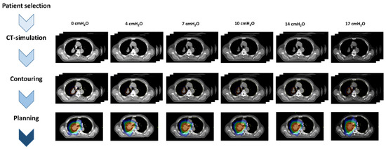There were some limitations to this study. First, the selection of the tumor location was biased. Since the patients were selected retrospectively, 76% of the patients had tumors in the upper lobe. Therefore, we were unable to analyze how the effects of CPAP differed according to tumor location. Second, four-dimensional CT (4D-CT) was not used for the CT simulation. Four-dimensional CT can determine the extent of tumor movement during respiration. The degree of reduction in tumor movement according to pressure makes it possible to set the PTV margin for each pressure, which can potentially further reduce the irradiation dose to normal organs, such as the lungs and heart. Third, this study focused on the changes in lung volume and dosimetric parameters according to pressure in the simulation. It was not clear whether the lung volume increased, similar to the simulation, when the same pressure is applied during treatment. For practical application, further studies are needed to confirm whether the lung volume increases consistently when the same pressure is applied during treatment.