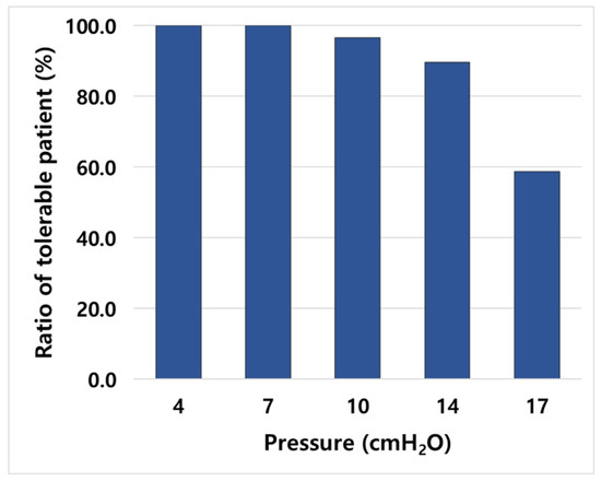 A total of 158 CT datasets were obtained with 1, 2, 9, and 17 patients who tolerated up to 7, 10, 14, and 17 cmH2O, respectively. Cumulatively, approximately 90% of the patients tolerated up to 14 cmH2O, and only 59% of the patients tolerated up to 17 cmH2O (Figure 2).