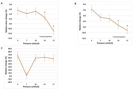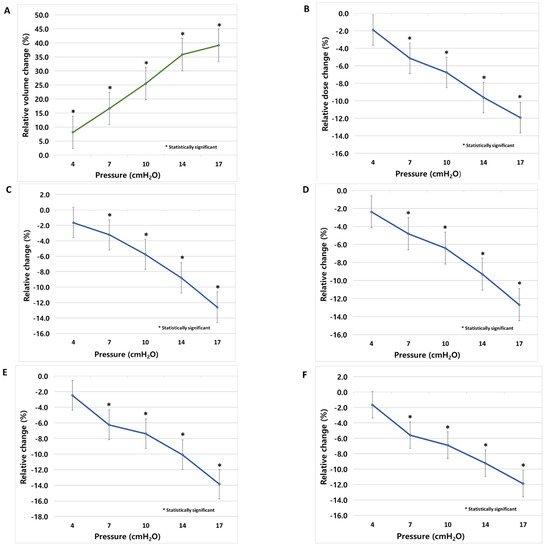 The Dmean for the lung were 1573.5 ± 314.0 cGy, 1545.9 ± 327.7 cGy, 1495.3 ± 330.8 cGy, 1455.9 ± 334.6 cGy, 1392.8 ± 304.4 cGy and 1443.4 ± 268.7 cGy from baseline in the order of 4, 7, 10, 14 and 17 cmH2O (Table 2). It decreased significantly from 7 cmH2O and decreased by 5.1–11.9% as the pressure increased (Figure 3B). Significant decreases were observed when the interpressure was increased from 4 to 7 cmH2O and from 10 to 14 cmH2O (Figure S1(A2)).