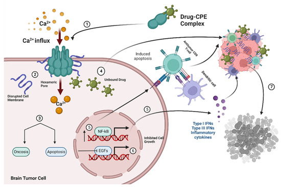 (1) Drug–CPE complex interacts with Claudin-4 receptors in brain metastatic tumor cells and forms a hexameric pore causing increases in influx of Ca2+, osmotic dysregulation, and membrane disruption (2), which leads to apoptosis or oncosis (3,4). Unbound drugs are delivered into tumor cells and further mediate cell destruction upon binding by exerting antitumor effects on cancer cells while (5,6) the modulation of growth factor signaling and nfKB increase cell death by decreasing cell proliferation and increasing expression of inflammatory cytokines and immune cells (7).