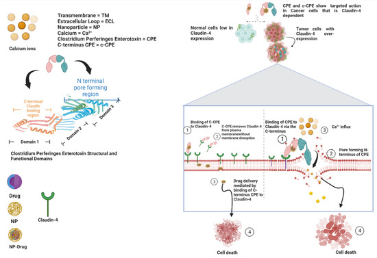 In colon epithelia, Ca2+ levels, electrophysiological reports of Ca2+ uptake, and calcium-detection microscopy have confirmed that CPE interaction with Claudin-4 in TJs determines the extent to which CPE can disrupt TJs and mediate cytotoxicity [45]. Through pore formation in plasma membranes upon binding to Claudin-4 and the subsequent influx of Ca2+, CPE causes fluid and electrolyte loss, apoptosis, and oncosis via the activation of calmodulin and calpain [46]. In breast cancer, CPE treatment has also shown Claudin-4 dependence [47]. The tumorigenesis, progression, and pathology of breast cancer have been linked to different expressions of Claudins, and Claudin-4 has proved very powerful in predicting survival [28,29,30]. An evaluation of lymph node metastases has shown that Claudin-4 overexpression is a predictor of poorer outcomes in breast cancers [28]. The brain has little or no Claudin-4 expression in contrast to brain tumors where Claudin-4 is overexpressed. Only cells of epithelial origin express Claudin-4, whereas brain cells are of mesenchymal origin. Therefore, it is mainly metastatic brain tumors that express Claudin-4. This helps to successfully target a brain tumor and not normal CNS tissue [48].
