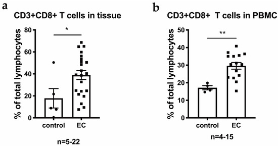 CD8 T cells are enriched in TILs from EC. (a) The percentages of CD8 T cells among all lymphocytes in EC tissue, prolapsed uterus (control) and (b) PBMCs from the corresponding patients. p value compares the indicated group using an unpaired t-test (two-tailed). (*), (**).