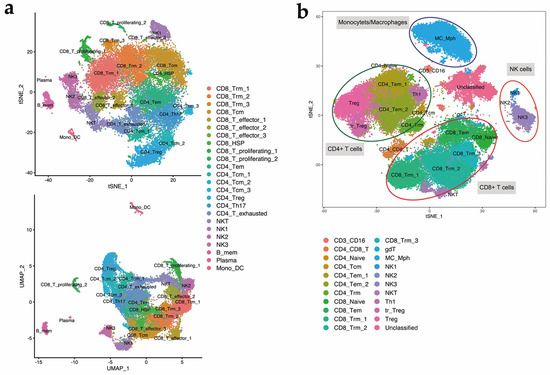 Regarding NK cells (Figure 2a), we identified three subsets that were separated by dimensional reduction analysis. Two subsets were equal to the canonical peripheral human NK cell subsets, which are CD16+ CD56dim NK cells and CD16− CD56bright NK cells and were labeled “NK1” and “NK3”, respectively. Another noncanonical population was labeled “NK2”. As shown in Figure 2a, 17 clusters of T lymphocytes were identified, among which 10 clusters were classified as CD8+ T cells, and the remaining 7 clusters were considered CD4+ T cells. Some canonical T cell subsets, including CD8+ effector T cells, CD8+ memory T cells, and CD4+ central memory T cells, showed heterogeneity and were clustered into several subsets. When focusing on CD8+ T cells, one major subset was not classified as either TEM cells (defined as SELL− CCR7− S1PR1+ KLF2+ CD69− T cells) or TCM cells (defined as SELL+ CCR7+ KLF2+ S1PR1+ CD69− T cells) [16] due to their unique expression of PRDM1 (B lymphocyte-induced maturation protein (Blimp)) 1 and ZNF683 (Hobit). This subpopulation of T cells is a well-documented subset found in other types of tumors and is classified as tissue-resident memory T (TRM) cells.