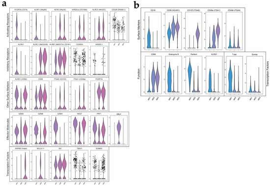 NK cell subset by single-cell RNA sequencing and mass cytometry: (a) Expression levels of selected markers in NK cell subsets (scRNA-seq). The expression levels of groups of genes that represent activating receptors, inhibitory receptors, effector molecules, transcription factors and other surface markers are shown; (b) The expression levels of certain surface markers, NK cell function-related markers and transcription factors by mass cytometry.