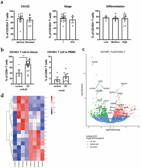 CD103+ CD8+ T cells are the main components of CD8+ T cells: (a) The relationship between the abundance of CD103+ CD8+ T cells and clinical features, including CA125 levels, tumor stage and tumor differentiation. (b) In patients with EC, the percentage of CD103+ CD8+ T cells among all CD8+ T cells was significantly increased in TILs compared to that in the POP controls. However, the percentage of CD103+ CD8+ T cells among all CD8+ T cells was not significantly increased in PBMCs from patients with EC compared to PBMCs from POP control. (c) The volcano plot displays significantly differentially expressed genes between CD103+ (CD103P) and CD103− (CD103N) in flow-sorted CD8+ T cells from n = 3 independent patients. Unadjusted values are shown. Upregulated genes in CD103+ CD8+ T cells are marked in red, and downregulated genes are marked in green. (d) A heatmap is shown comparing gene signatures derived from the bulk RNA-seq analysis (CD103+ versus CD103−) of three individuals. p value compares the indicated group using an unpaired t-test (two-tailed). (**).