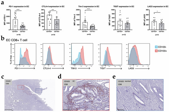 The expression levels of immune checkpoints in TRM cell: (a) The expression levels of PD-1, CTLA4, Tim-3 and LAG3 were significantly increased in CD103+ CD8+ T cells; (b) One sample of the expression of PD-1, CTLA4, Tim-3 and LAG3 between CD103+ CD8+ T cells and CD103− CD8+ T cells. (c) The distribution of CD103+ CD8+ cells detected using double immunohistochemical staining in a whole-slide red box: EC, blue box: normal. Partial magnification of (d) EC tumor tissue and (e) Adjacent normal endometrium. CD8+: red; CD103+: brown. p value compares the indicated group using an unpaired t-test (two-tailed). (*), (***), (****).
