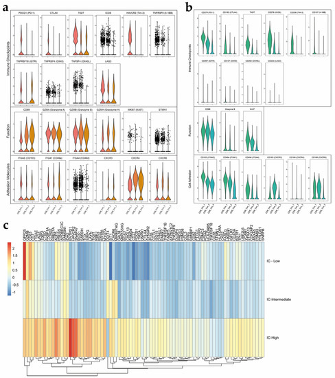 TRM cell subsets in EC show heterogeneity. (a) Expression levels of selected markers in TRM cell subsets (scRNA-seq); (b) Expression levels of selected markers in TRM cell subsets (mass cytometry). Expression levels of the group of genes that represent immune checkpoint- and cell function (cytotoxicity)-related molecules and adhesion molecules shown in (a,b); (c) Heatmaps comparing genes in TRM subsets. TRM cells were divided into three subsets according to immune checkpoint molecule expression.