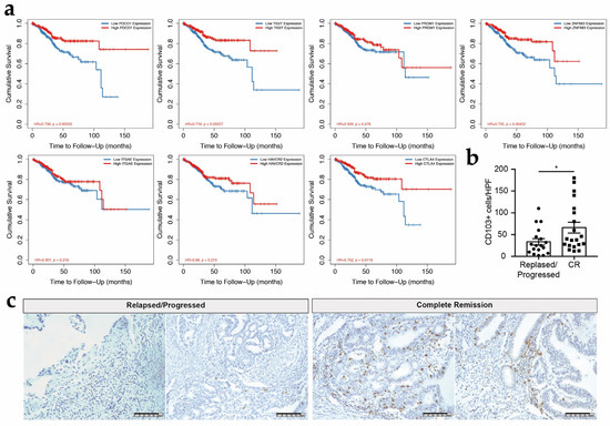 By comparing the results of immunohistochemical staining from the patients who had achieved complete remission (CR) for 5 years (n = 20) with those who relapsed or had progressive disease (n = 18), the CD103+ cell density in the relapsed group was significantly lower than that in the CR group (8.3/high-power field (HPF) versus 15.8/HPF, respectively) (Figure 7b,c). Thus, CD103+ CD8+ T cells may predict the survival of patients with EC, which may be related to the high expression of immune checkpoints and suggested that CD103+ CD8+ T cells have antitumor immune functions.