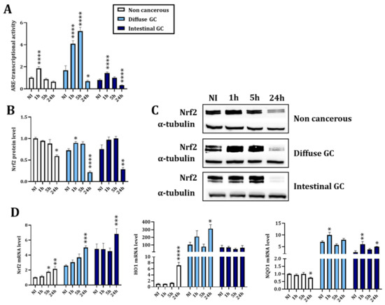 To evaluate the modulation of Nrf2 upon infection, three gastric epithelial cell lines (HFE-145: non-cancerous, AGS: diffuse type GC and MKN74: intestinal type GC) were infected with H. pylori P12 strain for 1, 5 or 24 h. We observed a significant increase in Nrf2 activity measured by the ARE transcriptional activity 1 h post-infection (hpi) (Figure 1A). However, 24 hpi, the activity of Nrf2 was normalized to basal levels in the non-cancerous cell line and significantly inhibited in the cancerous ones (Figure 1A). This was associated with a significant decrease in Nrf2 protein level (Figure 1B,C). The mRNA of Nrf2 and two of its target genes, HO1 and NQO1, were more expressed in both GC cell lines than in the non-cancerous one, but the kinetic trend did not follow Nrf2 activity and protein level, suggesting post-transcriptional regulations (Figure 1D).