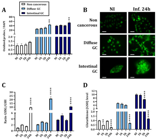 Infection with H. pylori increased the ROS production at 24 hpi, more particularly in both cancerous cell lines (Figure 2A,B). This might suggest that non-cancerous cells are able to handle the ROS accumulation in a more efficient way than the cancerous ones. Moreover, we observed an increased ratio of oxidized glutathione (GSSG) over total glutathione (GSH) (Figure 2C) at the same timepoint and in the three cell lines. This increased oxidative stress could be explained by the major drop in glutathione level 24 hpi observed in the three cell lines (Figure 2D). We observed that the non-cancerous cell line has a lower basal level of ROS and GSH compared to the two cancerous cell lines which seems to indicate a deregulation of GSH level and ROS elimination in gastric cancerous cells.