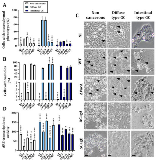 To decipher which H. pylori virulence factor among VacA, CagA or the T4SS is involved in the Nrf2 activity modulation, we infected the three cell lines with the P12-WT strain, VacA-deleted strain (ΔVacA), CagA-deleted strain (ΔCagA) or a T4SS-deficient strain (ΔCagE) for 24 h. We first validated our mutant H. pylori strains with phenotypic evaluation. As expected, infection with the WT strain was associated with an increase in both mesenchymal and vacuolated cells induced by CagA and VacA, respectively. Infection with ΔVacA was associated only with an increase in mesenchymal cells, also called hummingbird phenotype [34], and infection with ΔCagA or ΔCagE was associated only with an increase in vacuolated cells compared to non-infected cells (Figure 3A–C). An analysis of ARE transcriptional activity after infection with the mutant strains revealed some discrepancies depending on the cell line. In the absence of active VacA, Nrf2 transcriptional activity was restored compared to the non-infected in all three cell lines, indicating an implication of this virulence factor in the decrease in Nrf2 activity (Figure 3D). However, we cannot exclude a potential implication of CagA in the transcriptional activity of Nrf2 in the non-cancerous cells as well as an implication of the T4SS (observed with the ΔCagE strain) in the non-cancerous and diffuse type GC cells, even though the effect is less significant than with the ΔVacA strain and not observable in all the three cell lines (Figure 3D).