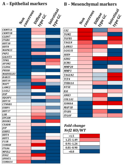 Nrf2 knock-out decreases epithelial and increases mesenchymal proteins in gastric non-cancerous, diffuse cancer or intestinal GC cell lines. Heat map from a proteomic analysis showing fold change between Nrf2-KO and Nrf2-WT for epithelial (A) and mesenchymal (B) proteins selected from the EMTome database [35]. Proteins were classified in increasing order of the fold change Nrf2-KO/Nrf2-WT of the non-cancerous cell line. n = 3 for each cell line.